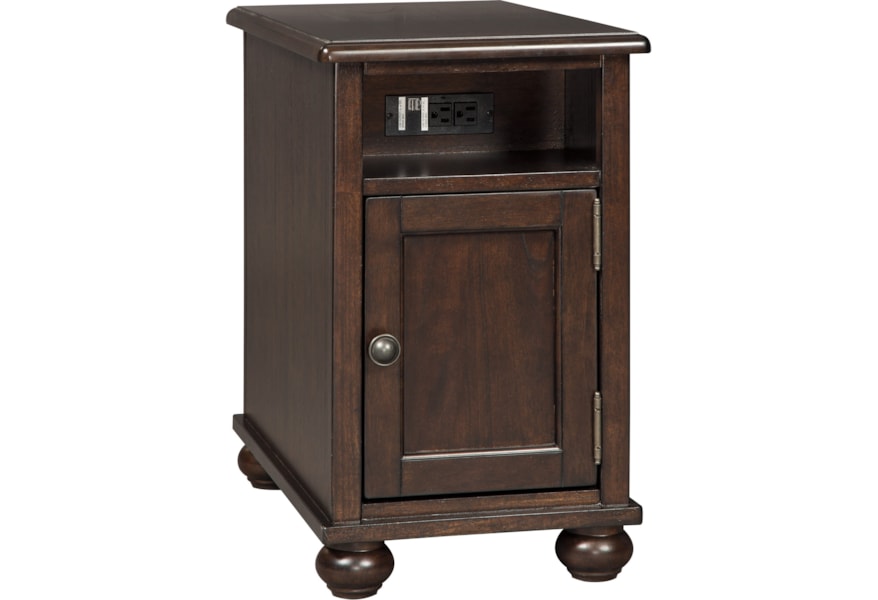 The Barilanni Chairside End Table with USB Ports Outlets by Signature Design by Ashley may be available at Old Brick Furniture Mattress Co. The Barilanni Chairside End Table with USB Ports Outlets by Signature Design by Ashley may be available at Turners Budget Furniture in the Albany Bonaire Moultrie Valdosta Thomasville Tallahassee and Tifton area. You wont have to leave a seat to charge electronic devices since this stylish companion has two handy built-in USB charging ports two AC outlets an open storage cubby and a lower cabinetperfect for tucking away all your chairside necessities.
